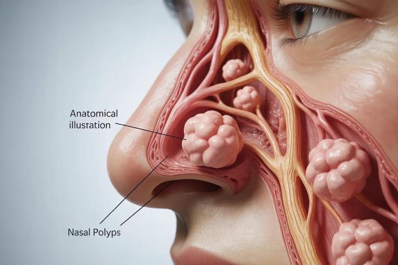 Nasal polyps are soft, painless growths that develop in the lining of the nasal passages or sinuses due to chronic inflammation. They can block airflow and lead to symptoms such as nasal congestion, reduced sense of smell, sinus infections, and breathing difficulties. Though non-cancerous, they may recur if not properly managed. Treatment options include medications to shrink polyps and, in severe cases, surgical removal. Long-term management focuses on controlling inflammation and preventing recurrence for improved breathing and comfort.